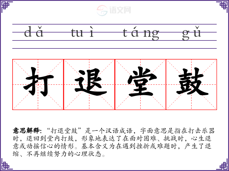“打退堂鼓”是一个汉语成语,字面意思是指在打击乐器时,退回到堂内打鼓,形象地表达了在面对困难、挑战时,心生退意或动摇信心的情形。基本含义为在遇到挫折或难题时,产生了退缩、不再继续努力的心理状态。