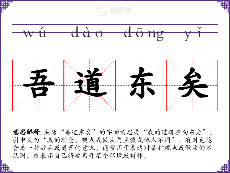 成语“吾道东矣”的字面意思是“我的道路在向东走”,引申义为“我的理念、观点或做法与主流或他人不同”,有时也隐含着一种放弃或离开的意味。通常用于表达对某种观点或做法的不认同,或表示自己将要离开某个环境或群体。