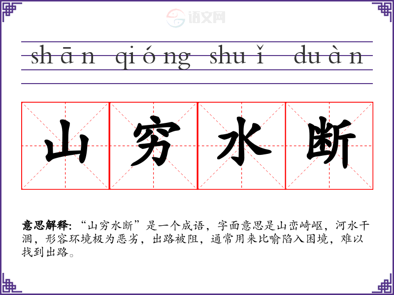 “山穷水断”是一个成语,字面意思是山峦崎岖,河水干涸,形容环境极为恶劣,出路被阻,通常用来比喻陷入困境,难以找到出路。