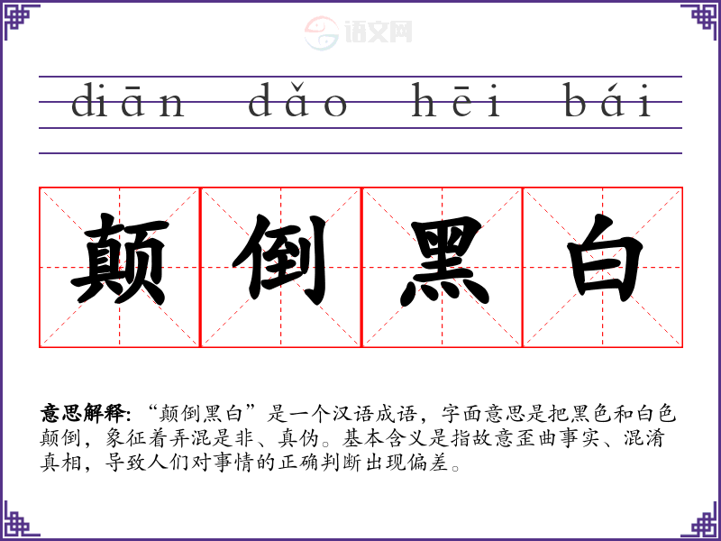 “颠倒黑白”是一个汉语成语,字面意思是把黑色和白色颠倒,象征着弄混是非、真伪。基本含义是指故意歪曲事实、混淆真相,导致人们对事情的正确判断出现偏差。