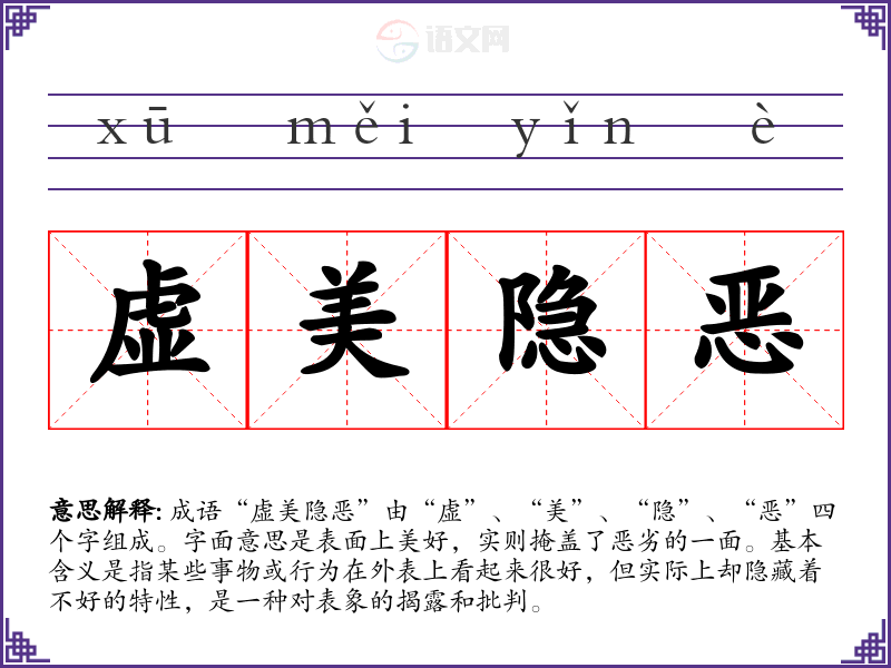 成语“虚美隐恶”由“虚”、“美”、“隐”、“恶”四个字组成。字面意思是表面上美好,实则掩盖了恶劣的一面。基本含义是指某些事物或行为在外表上看起来很好,但实际上却隐藏着不好的特性,是一种对表象的揭露和批判。