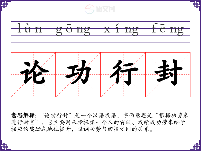 “论功行封”是一个汉语成语,字面意思是“根据功劳来进行封赏”。它主要用来指根据一个人的贡献、成绩或功劳来给予相应的奖励或地位提升,强调功劳与回报之间的关系。