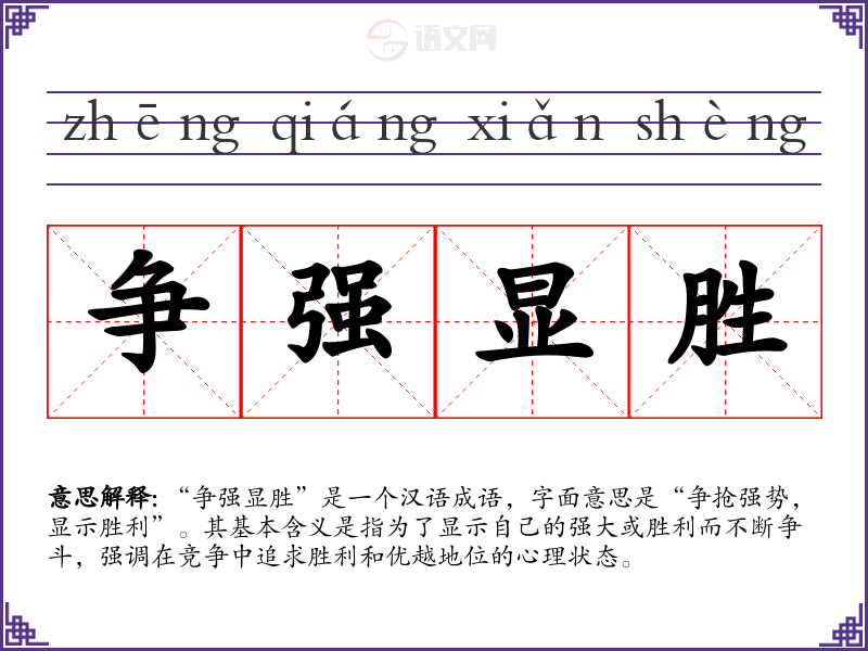 “争强显胜”是一个汉语成语,字面意思是“争抢强势,显示胜利”。其基本含义是指为了显示自己的强大或胜利而不断争斗,强调在竞争中追求胜利和优越地位的心理状态。