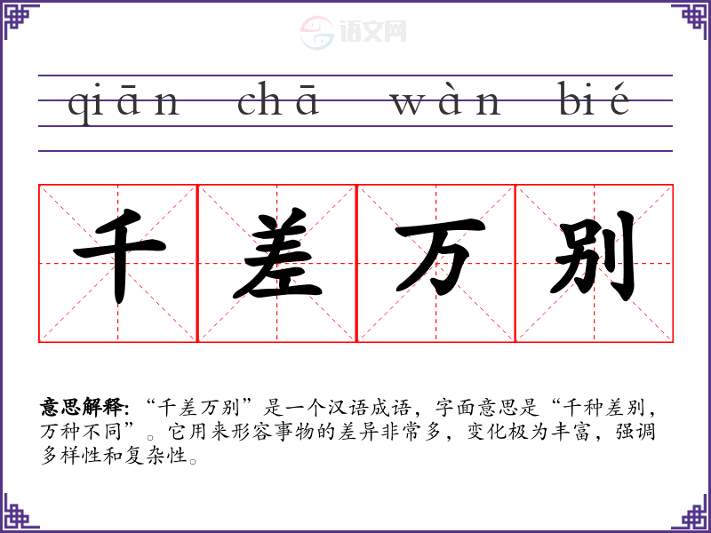“千差万别”是一个汉语成语,字面意思是“千种差别,万种不同”。它用来形容事物的差异非常多,变化极为丰富,强调多样性和复杂性。