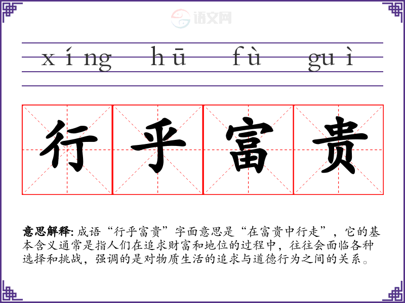 成语“行乎富贵”字面意思是“在富贵中行走”,它的基本含义通常是指人们在追求财富和地位的过程中,往往会面临各种选择和挑战,强调的是对物质生活的追求与道德行为之间的关系。