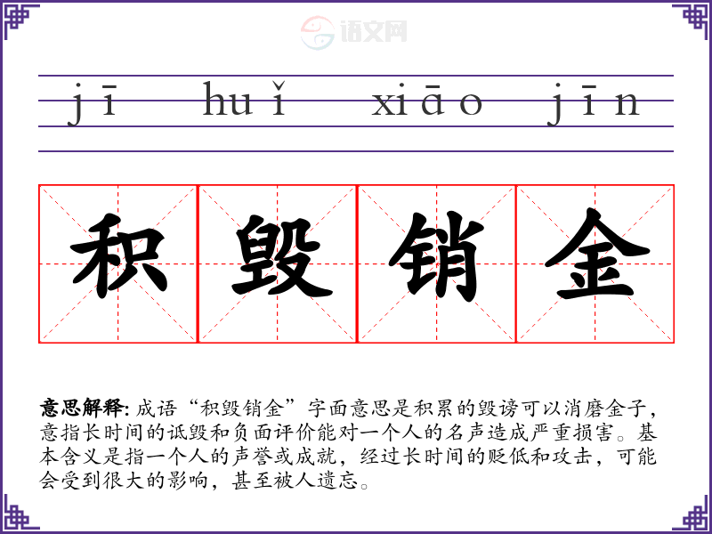 成语“积毁销金”字面意思是积累的毁谤可以消磨金子,意指长时间的诋毁和负面评价能对一个人的名声造成严重损害。基本含义是指一个人的声誉或成就,经过长时间的贬低和攻击,可能会受到很大的影响,甚至被人遗忘。