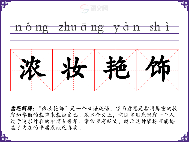 “浓妆艳饰”是一个汉语成语,字面意思是指用厚重的妆容和华丽的装饰来装扮自己。基本含义上,它通常用来形容一个人过于追求外表的华丽和奢华,常常带有贬义,暗示这种装扮可能掩盖了内在的平庸或缺乏真实。