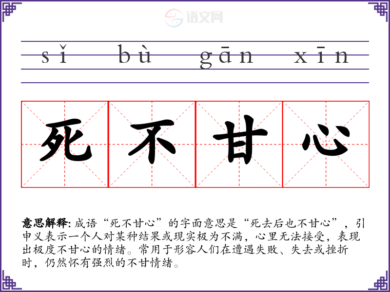 成语“死不甘心”的字面意思是“死去后也不甘心”,引申义表示一个人对某种结果或现实极为不满,心里无法接受,表现出极度不甘心的情绪。常用于形容人们在遭遇失败、失去或挫折时,仍然怀有强烈的不甘情绪。