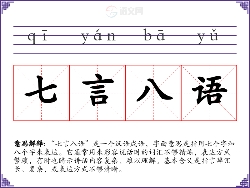 “七言八语”是一个汉语成语,字面意思是指用七个字和八个字来表达。它通常用来形容说话时的词汇不够精炼,表达方式繁琐,有时也暗示讲话内容复杂、难以理解。基本含义是指言辞冗长、复杂,或表达方式不够清晰。
