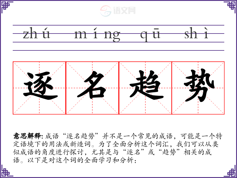 成语“逐名趋势”并不是一个常见的成语,可能是一个特定语境下的用法或新造词。为了全面分析这个词汇,我们可以从类似成语的角度进行探讨,尤其是与“逐名”或“趋势”相关的成语。以下是对这个词的全面学习和分析: