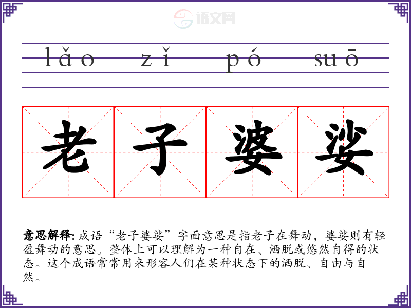 成语“老子婆娑”字面意思是指老子在舞动,婆娑则有轻盈舞动的意思。整体上可以理解为一种自在、洒脱或悠然自得的状态。这个成语常常用来形容人们在某种状态下的洒脱、自由与自然。