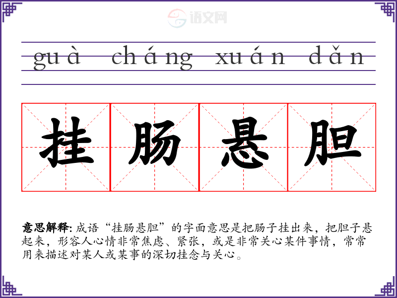 成语“挂肠悬胆”的字面意思是把肠子挂出来,把胆子悬起来,形容人心情非常焦虑、紧张,或是非常关心某件事情,常常用来描述对某人或某事的深切挂念与关心。