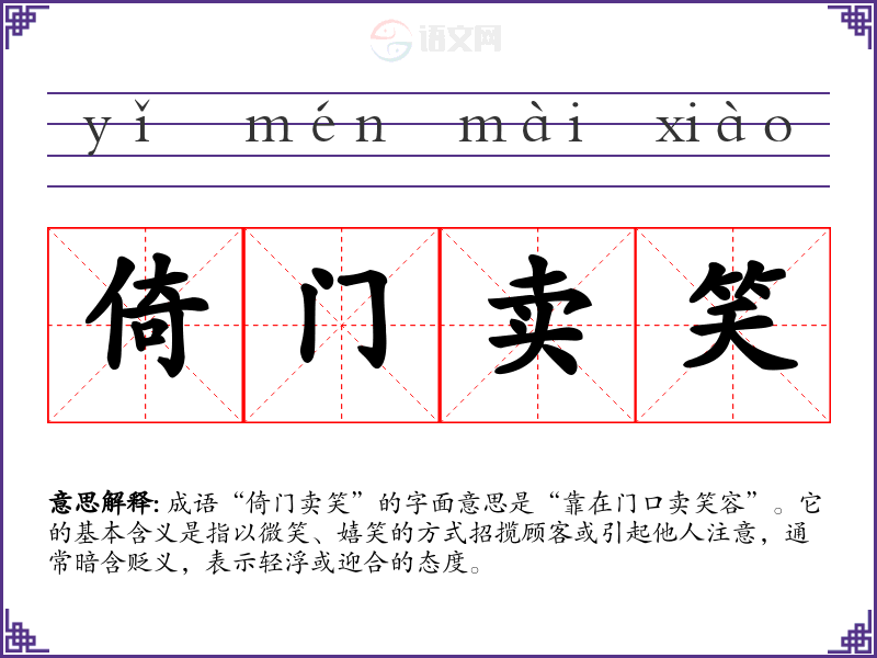 成语“倚门卖笑”的字面意思是“靠在门口卖笑容”。它的基本含义是指以微笑、嬉笑的方式招揽顾客或引起他人注意,通常暗含贬义,表示轻浮或迎合的态度。