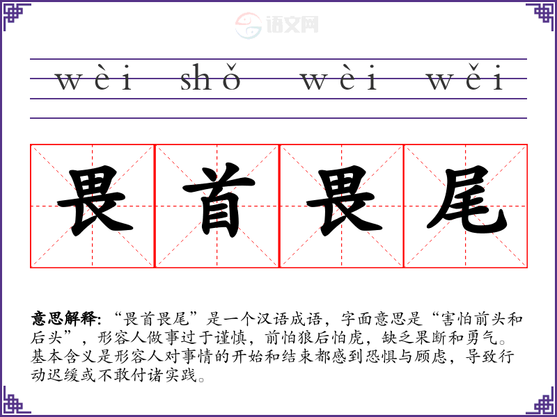 “畏首畏尾”是一个汉语成语,字面意思是“害怕前头和后头”,形容人做事过于谨慎,前怕狼后怕虎,缺乏果断和勇气。基本含义是形容人对事情的开始和结束都感到恐惧与顾虑,导致行动迟缓或不敢付诸实践。