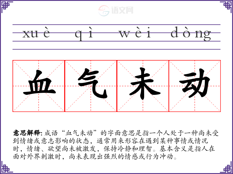 成语“血气未动”的字面意思是指一个人处于一种尚未受到情绪或意志影响的状态,通常用来形容在遇到某种事情或情况时,情绪、欲望尚未被激发,保持冷静和理智。基本含义是指人在面对外界刺激时,尚未表现出强烈的情感或行为冲动。
