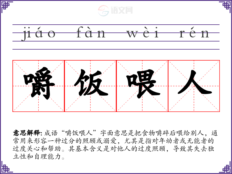 成语“嚼饭喂人”字面意思是把食物嚼碎后喂给别人,通常用来形容一种过分的照顾或溺爱,尤其是指对年幼者或无能者的过度关心和帮助。其基本含义是对他人的过度照顾,导致其失去独立性和自理能力。