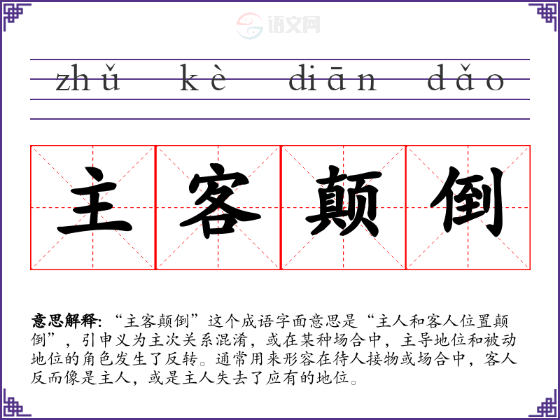 “主客颠倒”这个成语字面意思是“主人和客人位置颠倒”,引申义为主次关系混淆,或在某种场合中,主导地位和被动地位的角色发生了反转。通常用来形容在待人接物或场合中,客人反而像是主人,或是主人失去了应有的地位。