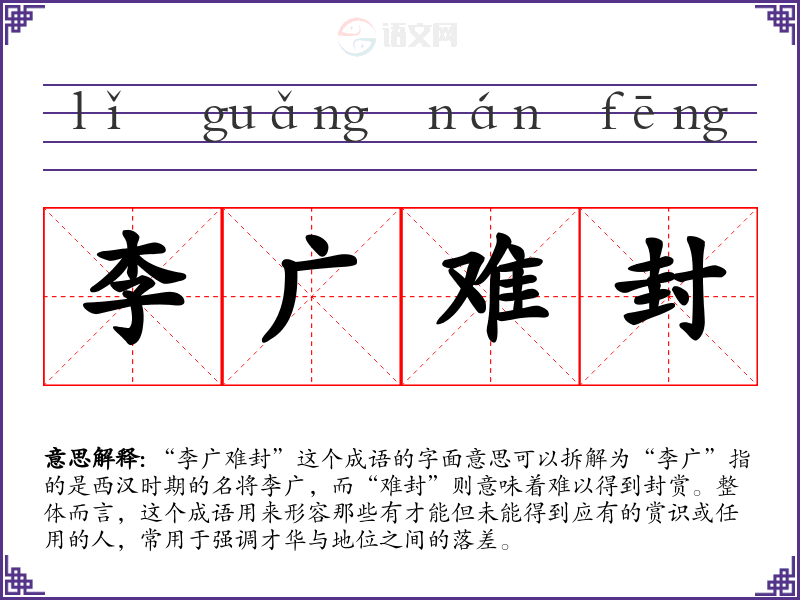 “李广难封”这个成语的字面意思可以拆解为“李广”指的是西汉时期的名将李广,而“难封”则意味着难以得到封赏。整体而言,这个成语用来形容那些有才能但未能得到应有的赏识或任用的人,常用于强调才华与地位之间的落差。