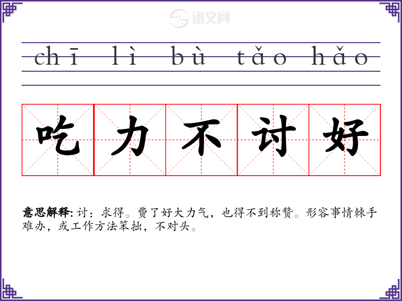 讨:求得。费了好大力气,也得不到称赞。形容事情棘手难办,或工作方法笨拙,不对头。