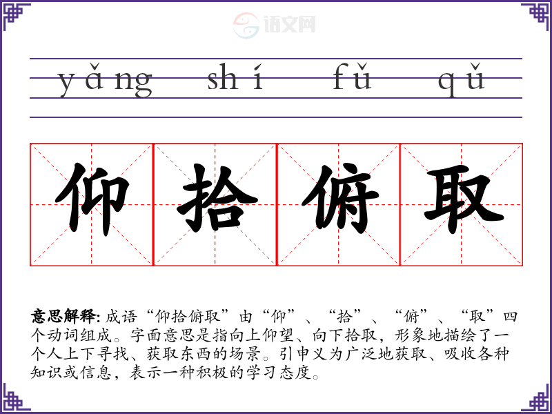 成语“仰拾俯取”由“仰”、“拾”、“俯”、“取”四个动词组成。字面意思是指向上仰望、向下拾取,形象地描绘了一个人上下寻找、获取东西的场景。引申义为广泛地获取、吸收各种知识或信息,表示一种积极的学*态度。