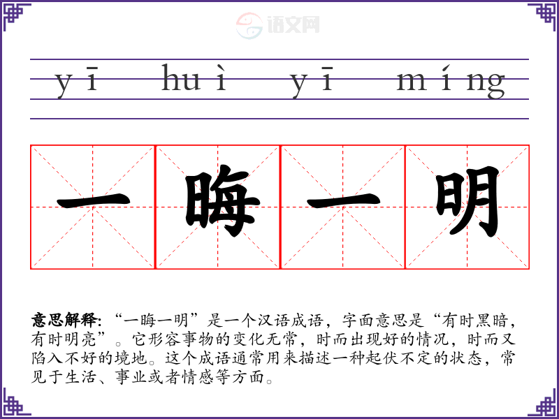 “一晦一明”是一个汉语成语,字面意思是“有时黑暗,有时明亮”。它形容事物的变化无常,时而出现好的情况,时而又陷入不好的境地。这个成语通常用来描述一种起伏不定的状态,常见于生活、事业或者情感等方面。