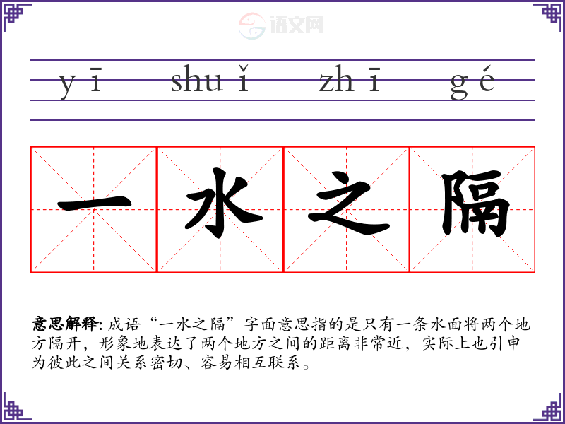 成语“一水之隔”字面意思指的是只有一条水面将两个地方隔开,形象地表达了两个地方之间的距离非常近,实际上也引申为彼此之间关系密切、容易相互联系。