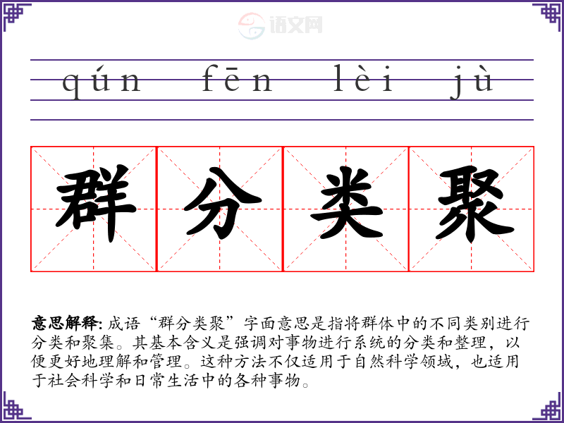 成语“群分类聚”字面意思是指将群体中的不同类别进行分类和聚集。其基本含义是强调对事物进行系统的分类和整理,以便更好地理解和管理。这种方法不仅适用于自然科学领域,也适用于社会科学和日常生活中的各种事物。