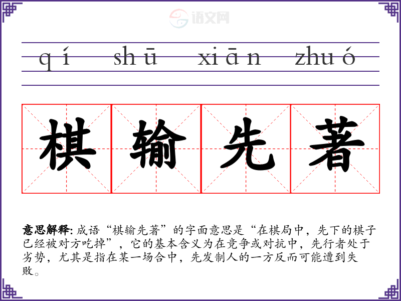 成语“棋输先著”的字面意思是“在棋局中,先下的棋子已经被对方吃掉”,它的基本含义为在竞争或对抗中,先行者处于劣势,尤其是指在某一场合中,先发制人的一方反而可能遭到失败。