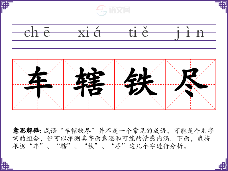 由于“车辖铁尽”并不是一个广为人知的成语,无法找到具体的历史背景或文学出处。可能是现代人基于某种情境自创的表达,或者是对某些成语的误读或误用。