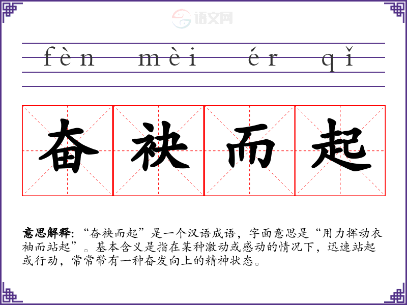 “奋袂而起”是一个汉语成语,字面意思是“用力挥动衣袖而站起”。基本含义是指在某种激动或感动的情况下,迅速站起或行动,常常带有一种奋发向上的精神状态。