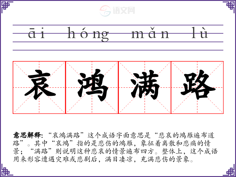 在其他文化中,类似表达也存在,如英语中的“sorrow everywhere”,都传达了人们对悲痛情景的感知与反思。然而,成语“哀鸿满路”更特指因离散而产生的悲伤,蕴藏着更深的历史与文化背景。