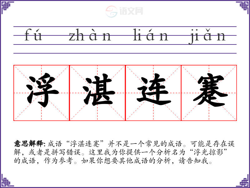成语“浮湛连蹇”并不是一个常见的成语。可能是存在误解,或者是拼写错误。这里我为你提供一个分析名为“浮光掠影”的成语,作为参考。如果你想要其他成语的分析,请告知我。