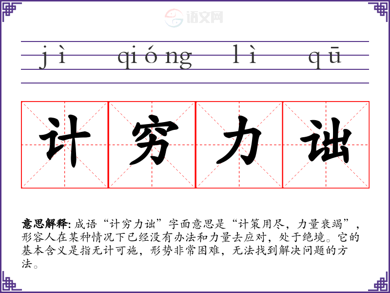 - 日常对话:在朋友之间的聊天中,可以用来形容生活中遇到的难题,如“我现在的工作计划真的计穷力诎,想不到任何办法来解决”。