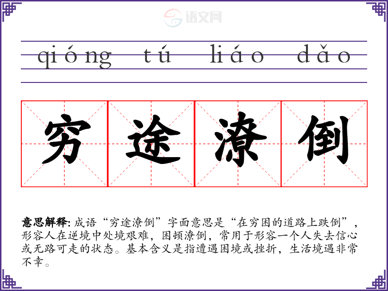 成语“穷途潦倒”字面意思是“在穷困的道路上跌倒”,形容人在逆境中处境艰难,困顿潦倒,常用于形容一个人失去信心或无路可走的状态。基本含义是指遭遇困境或挫折,生活境遇非常不幸。