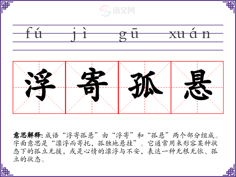 成语“浮寄孤悬”由“浮寄”和“孤悬”两个部分组成。字面意思是“漂浮而寄托,孤独地悬挂”。它通常用来形容某种状态下的孤立无援,或是心情的漂浮与不安,表达一种无根无依、孤立的状态。