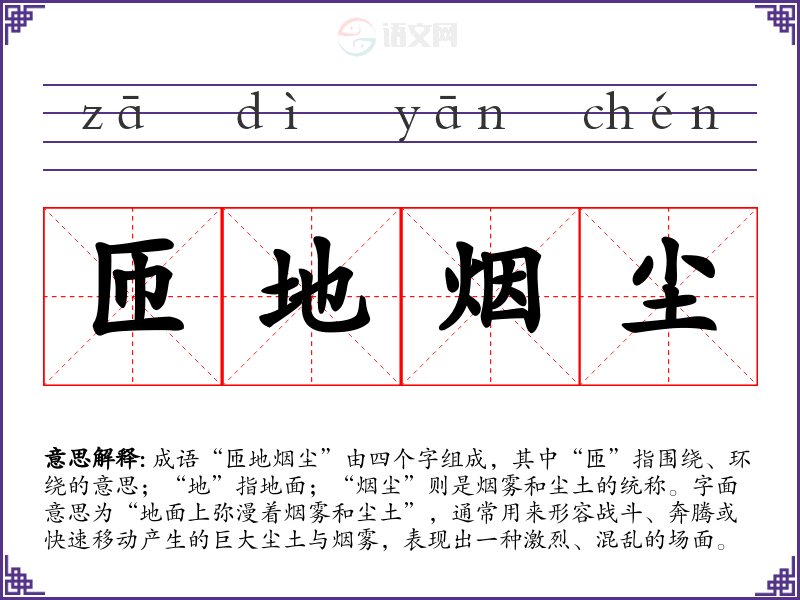 成语“匝地烟尘”由四个字组成,其中“匝”指围绕、环绕的意思;“地”指地面;“烟尘”则是烟雾和尘土的统称。字面意思为“地面上弥漫着烟雾和尘土”,通常用来形容战斗、奔腾或快速移动产生的巨大尘土与烟雾,表现出一种激烈、混乱的场面。