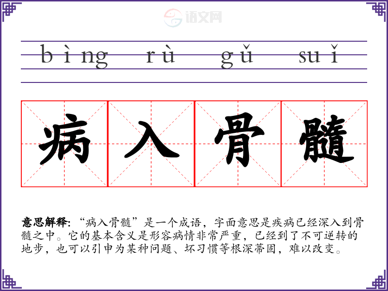 该成语的来源并不明确,但它常被用来形容病情的严重程度。在传统中医理论中,骨髓是人体最深层的部分,体现了健康的根基。因此,这个成语常常用来比喻一种深层次的问题,或某种状态已经到了非常严重的地步。