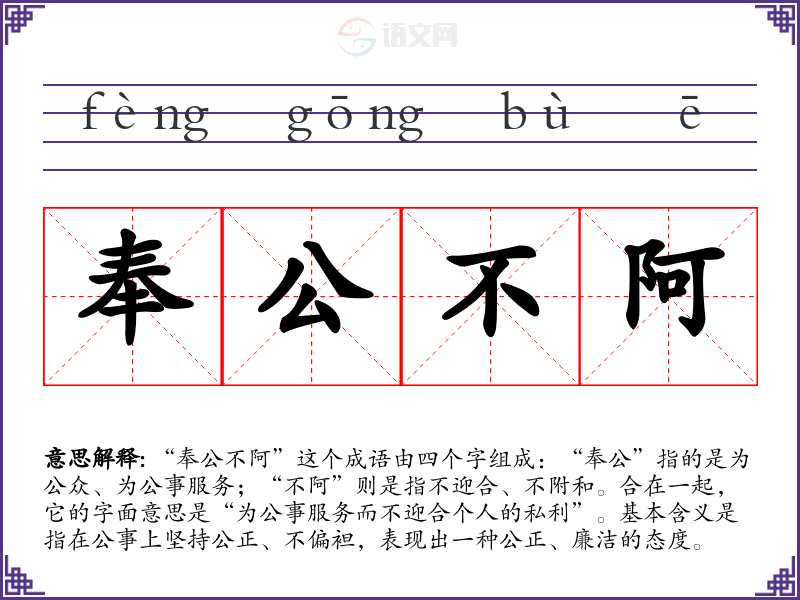 “奉公不阿”这个成语由四个字组成:“奉公”指的是为公众、为公事服务;“不阿”则是指不迎合、不附和。合在一起,它的字面意思是“为公事服务而不迎合个人的私利”。基本含义是指在公事上坚持公正、不偏袒,表现出一种公正、廉洁的态度。
