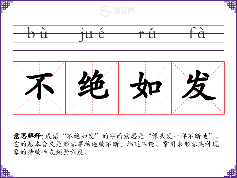 成语“不绝如发”的字面意思是“像头发一样不断地”。它的基本含义是形容事物连续不断,绵延不绝。常用来形容某种现象的持续性或频繁程度。