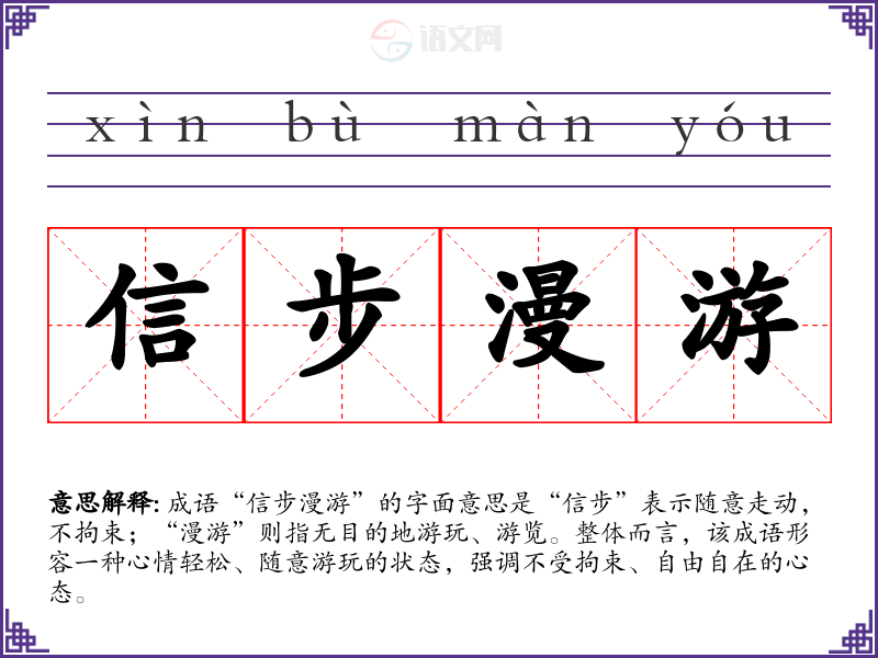 成语“信步漫游”的字面意思是“信步”表示随意走动,不拘束;“漫游”则指无目的地游玩、游览。整体而言,该成语形容一种心情轻松、随意游玩的状态,强调不受拘束、自由自在的心态。