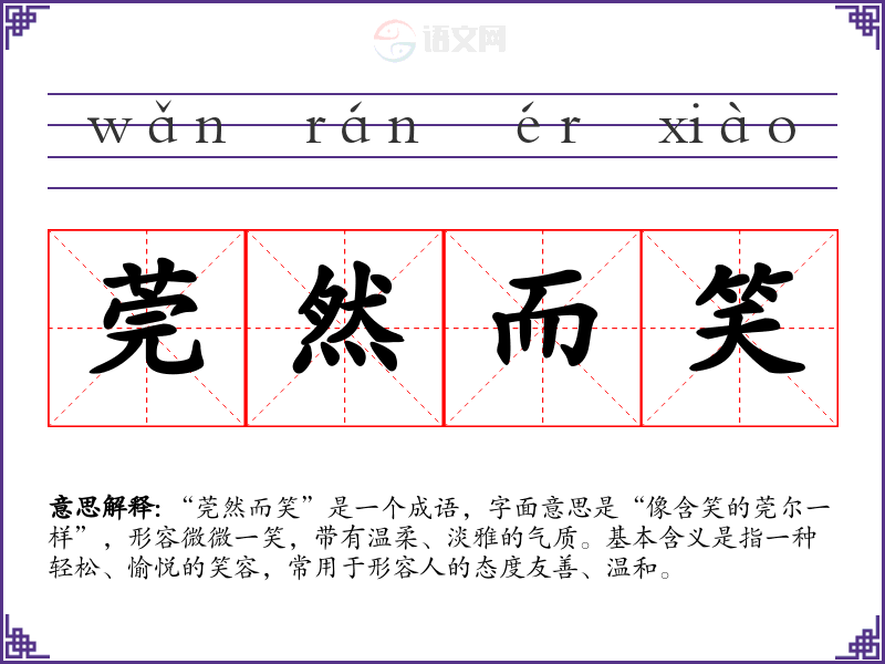 “莞然而笑”是一个成语,字面意思是“像含笑的莞尔一样”,形容微微一笑,带有温柔、淡雅的气质。基本含义是指一种轻松、愉悦的笑容,常用于形容人的态度友善、温和。