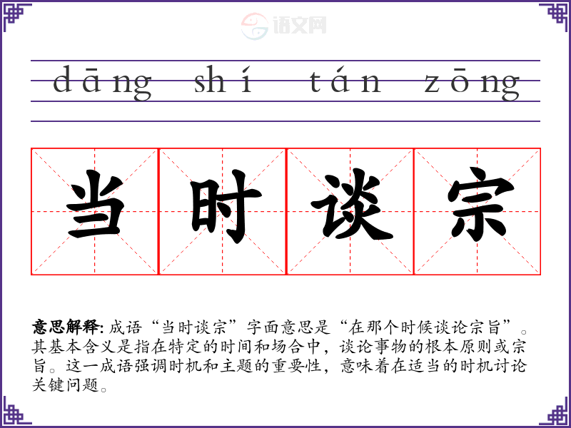 成语“当时谈宗”字面意思是“在那个时候谈论宗旨”。其基本含义是指在特定的时间和场合中,谈论事物的根本原则或宗旨。这一成语强调时机和主题的重要性,意味着在适当的时机讨论关键问题。
