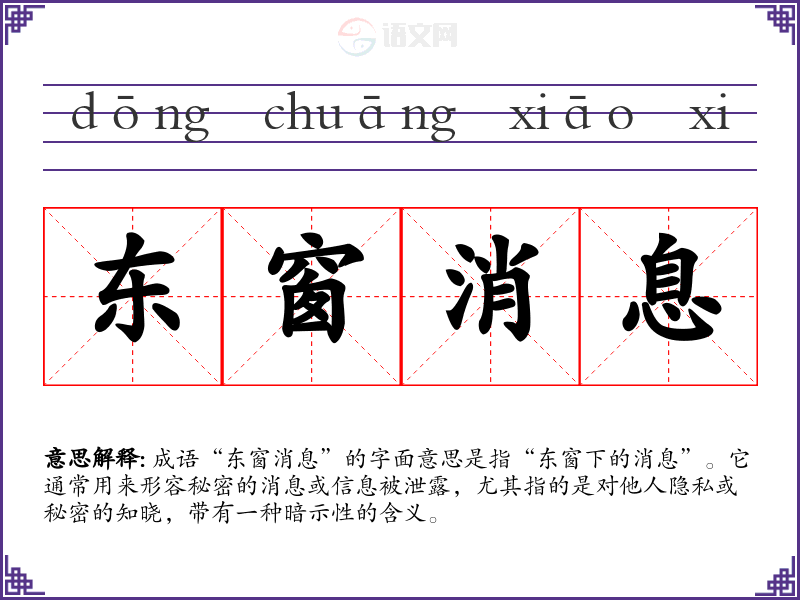 成语“东窗消息”的字面意思是指“东窗下的消息”。它通常用来形容秘密的消息或信息被泄露,尤其指的是对他人隐私或秘密的知晓,带有一种暗示性的含义。