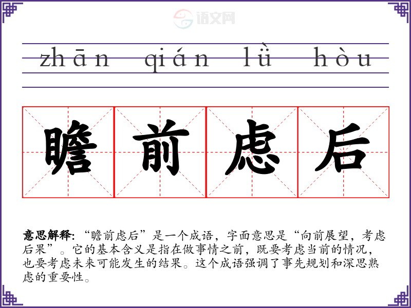 “瞻前虑后”是一个成语,字面意思是“向前展望,考虑后果”。它的基本含义是指在做事情之前,既要考虑当前的情况,也要考虑未来可能发生的结果。这个成语强调了事先规划和深思熟虑的重要性。
