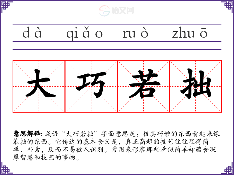 成语“大巧若拙”字面意思是:极其巧妙的东西看起来像笨拙的东西。它传达的基本含义是,真正高超的技艺往往显得简单、朴素,反而不易被人识别。常用来形容那些看似简单却蕴含深厚智慧和技艺的事物。