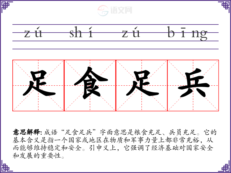 成语“足食足兵”字面意思是粮食充足、兵员充足。它的基本含义是指一个国家或地区在物质和军事力量上都非常充裕,从而能够维持稳定和安全。引申义上,它强调了经济基础对国家安全和发展的重要性。