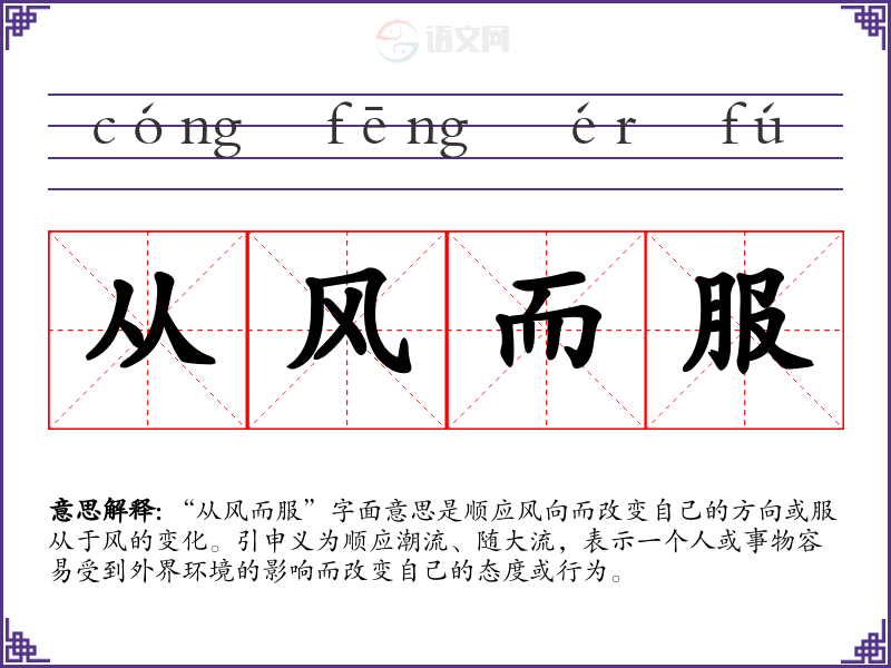 “从风而服”字面意思是顺应风向而改变自己的方向或服从于风的变化。引申义为顺应潮流、随大流,表示一个人或事物容易受到外界环境的影响而改变自己的态度或行为。