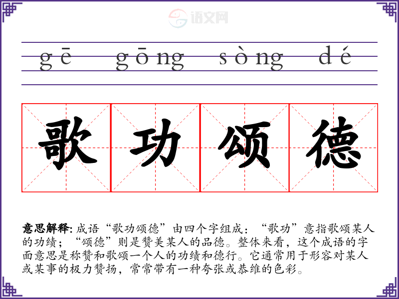 成语“歌功颂德”由四个字组成:“歌功”意指歌颂某人的功绩;“颂德”则是赞美某人的品德。整体来看,这个成语的字面意思是称赞和歌颂一个人的功绩和德行。它通常用于形容对某人或某事的极力赞扬,常常带有一种夸张或恭维的色彩。