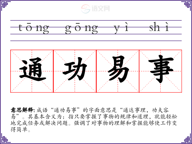 成语“通功易事”的字面意思是“通达事理,功夫容易”。其基本含义为:指只要掌握了事物的规律和道理,就能轻松地完成任务或解决问题。强调了对事物的理解和掌握能够使工作变得简单。