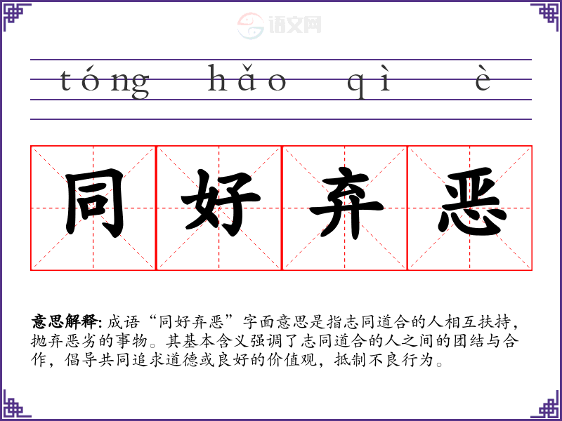 成语“同好弃恶”字面意思是指志同道合的人相互扶持,抛弃恶劣的事物。其基本含义强调了志同道合的人之间的团结与合作,倡导共同追求道德或良好的价值观,抵制不良行为。
